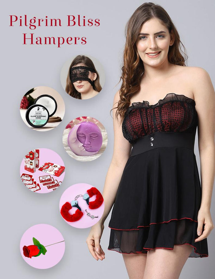 The Pilgrim Bliss gift hamper is a treasure trove of sensuality for partners seeking to re-ignite their passion. The combo comes with a mesmerizing babydoll dress and a selection of spicy add-ons. This semi-transparent intimate nightwear features an easy-fitting silhouette that cascades sensuously over every curve. The bust area is crafted with beautiful lace fabric while the frill details give this lingerie dress a cute and sexy appeal.