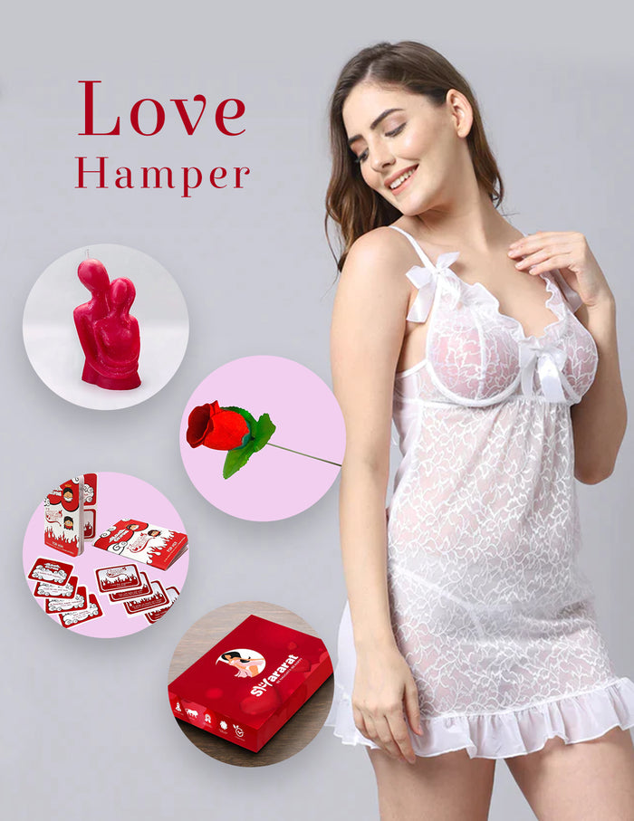 Alongside this mesmerizing babydoll nightdress for honeymoon, the package also includes heart and couple-shaped fragmented candles, a lace eye mask, a red rose, couple love coupons, and a pair of handcuffs.