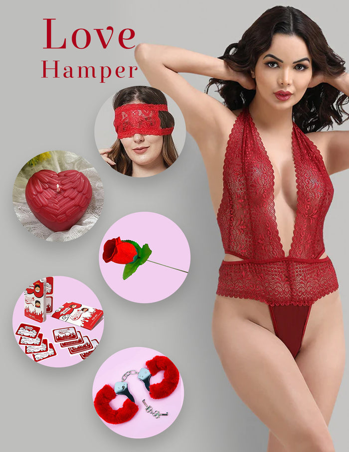 Our Love Hamper comes packed with naughty surprises that’ll help you unlock new dimensions of intimacy and rekindle the passion in your relationship. Here, you will receive beautifully crafted lace teddy babydoll nightwear, the perfect choice for those who define their style as bold but classy. The backless silhouette along with the playful extended slit in the front give this babydoll dress a daring appeal. Enhanced by its deep maroon color, this outfit radiates a sensual allure that is simply captivating.