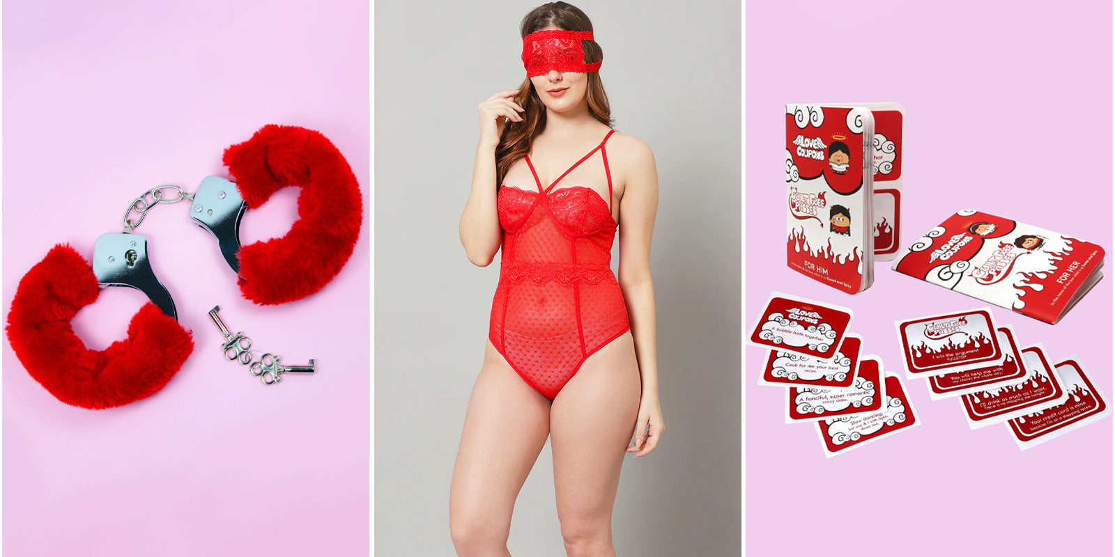 The box contains: 1 red babydoll teddy, an eye mask, and 1 Indigifts potli (handcuffs, a rose and 2 coupon books for him and her.